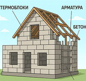 Будинки з термоблоків — це сучасна технологія будівництва, що дозволяє зводити стіни швидко і ефективно. Термоблок (або термоблок) — це будівельний елемент, що складається з двох стінок з пінополістиролу, з'єднаних між собою перемичками. Ці блоки збираються як конструктор, а всередину заливається бетон.